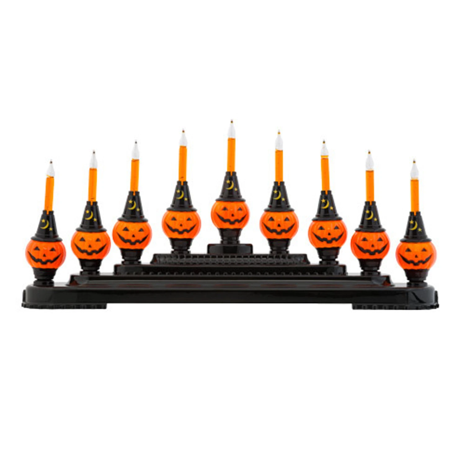 Celebrate Halloween in style with this adorable Shiny Brite Halloween Bubble Bright Pumpkin Light Candolier! It features 9 cute as can be jack-o-lanterns wearing wizard hats with an orange bubble light to top them off! This piece would look great on a mantle or as a centerpiece on a table. Plug in. Comes in original box. Made by Christopher Radko. Item #: 4027908