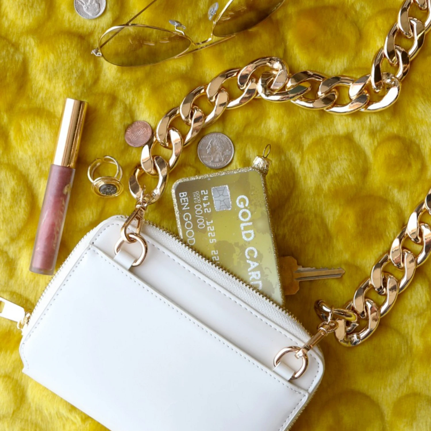 Time to flash that gold this holiday season! This ornament is perfect for those big spenders- it features a gold glitter credit card with the name “Ben Good” on the card! Made by Cody Foster. Made of glass. Dimensions: 3.75″L x .75″W x 2.5″H. Item #: GO-9921