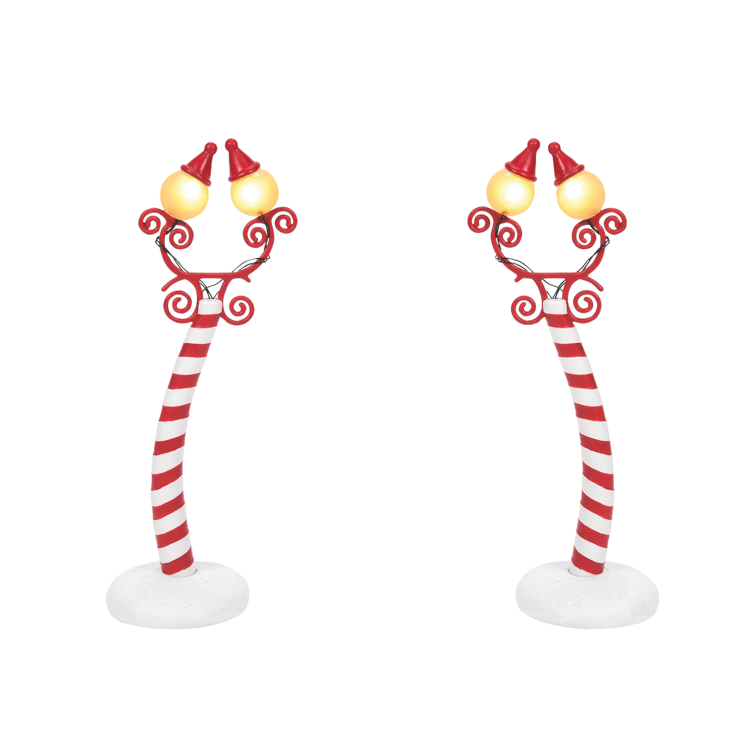 Christmas Town is a bright a colorful place, with playful buildings and accessories around the town- like these street lights! The pair feature wonky street lamps with red and white stripes with bright bulbs! Introduced January 2022. Made by Department 56. Made of resin. Dimensions: 5.25 in H x 1.75 in W x 2 in L. Item #: 6007743