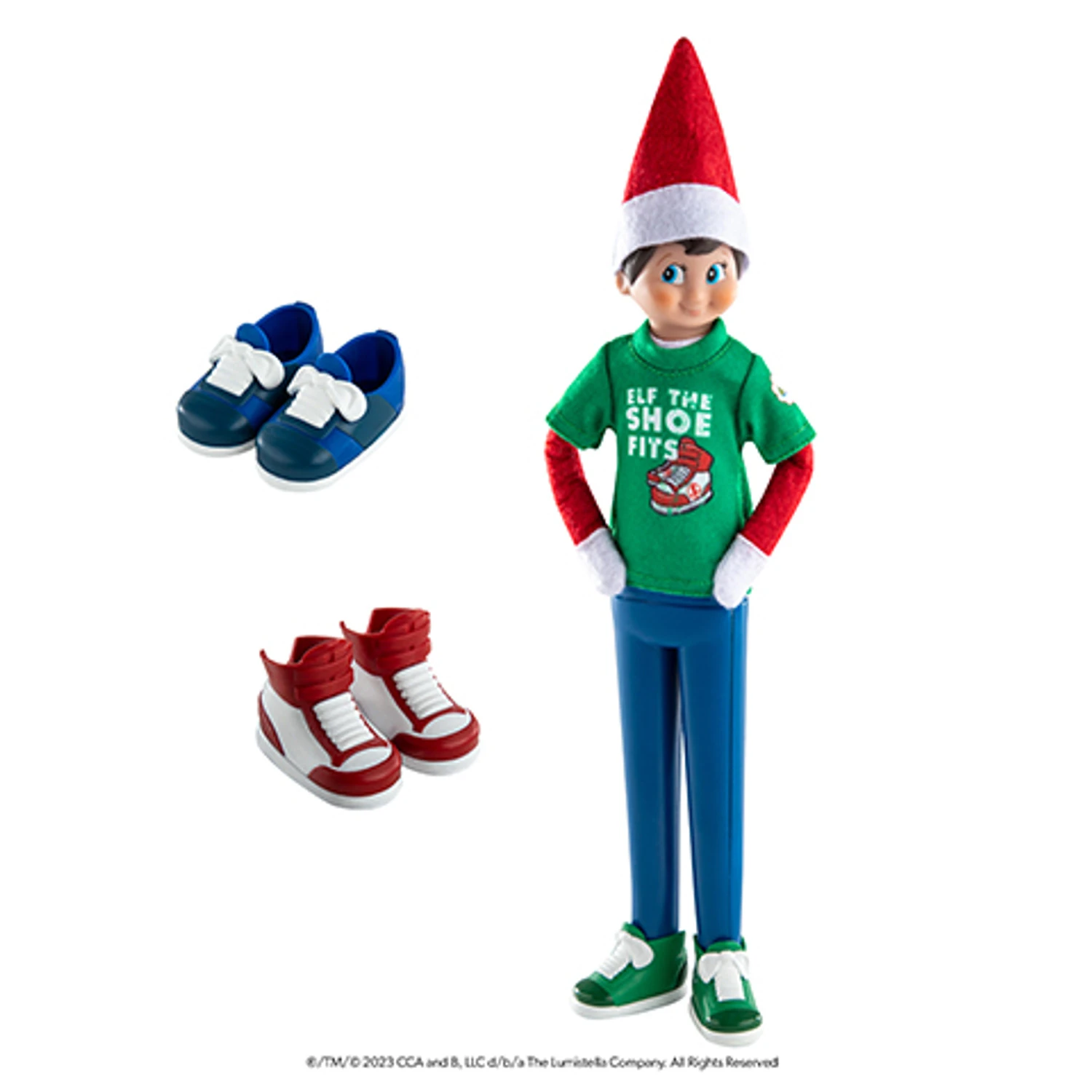 This outfit features a pair of jeans that help your Elf stand up straight, a green tee that has a punny “Elf the shoe fits!”, and three different pairs of sneakers to choose from! Item #: MFSNEAKER