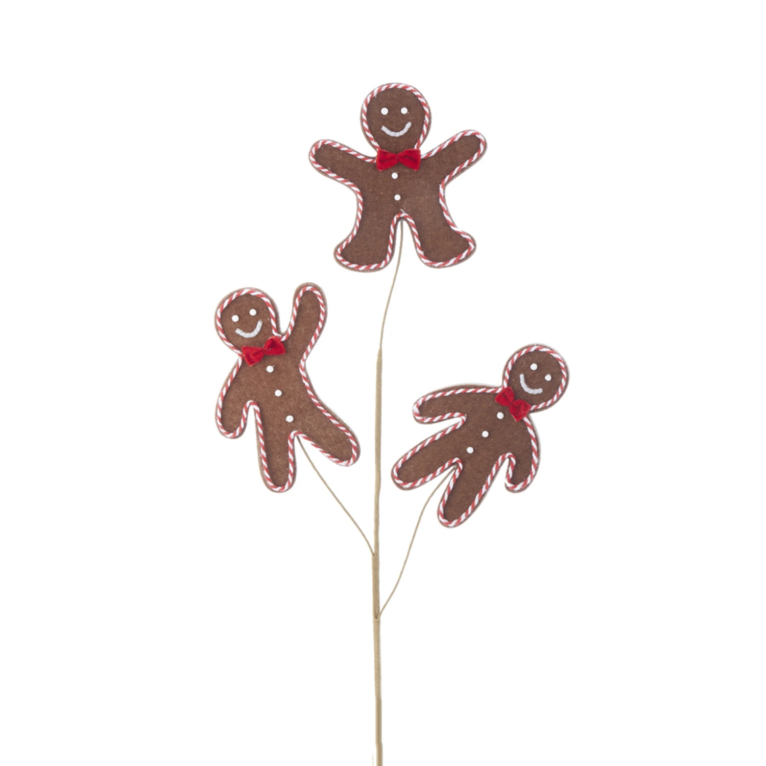 Add a few sweet treats to your tree this year! This Christmas tree pick features a trio of brown gingerbread men with red and white trim and a red bow on his neck! Made by Kurt Adler. Made of foam. Dimensions: 25″. Item #: C6958