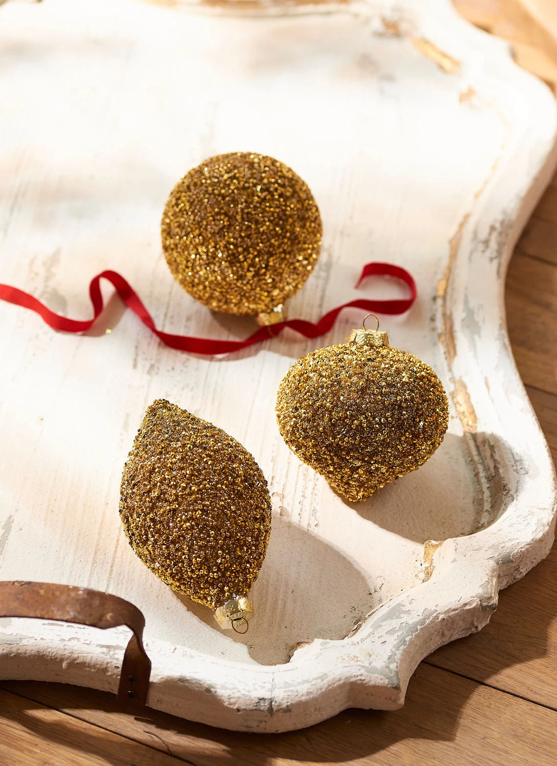 You can never have too much gold in your Christmas decor! These gorgeous ornaments are covered in sparkling gold beads that are sure to shine bright on your tree! Each sold individually OR as a set. Made by Raz Imports. Made of glass. Dimensions: 4″D X 4″H; 3.25″D X 6″H. Item #: 4322807